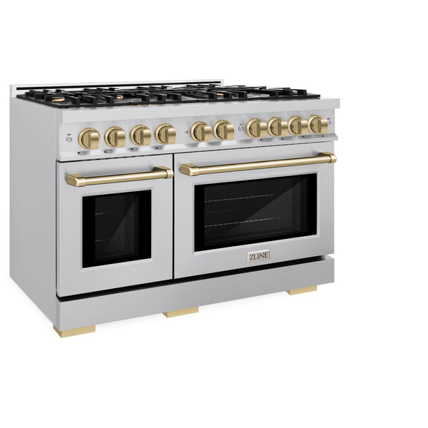 Luxury isn’t meant to be desired - it’s meant to be attainable. The ZLINE Autograph Edition 48 in. 6.7 cu. ft. Select Double Oven Gas Range with 8 Burner Cooktop in Stainless Steel and Champagne Bronze Accents (HGRZ-48-CB) combines the elegance of a hand-finished porcelain gas cooktop with 8 Italian-made auto-reignition burners, a large gas convection oven with an energy-efficient cooling fan to ensure quiet operation, a small baking oven, Horizon oven door window designs, and stunning champagne bronze knobs and handles allowing you to master every meal. With a modern, timeless style and refined functionality, ZLINE Select Gas Ranges are masterfully crafted to deliver an elevated culinary experience.