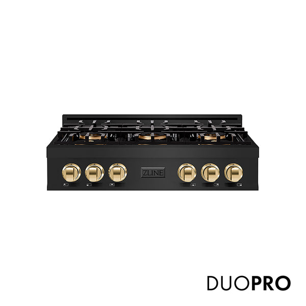 Luxury isn’t meant to be left desired—it’s meant to be attainable. The ZLINE Autograph Edition 36 in. Classic Gas Rangetop with 6 Burner DuoPro™ Cooktop in Black Stainless Steel and Polished Gold Accents (PCRTBZ-36-G) features a high-powered gas cooktop with 6 hand-crafted Italian dual-ring brass burners and an expansive one-piece porcelain cooktop allowing you to master every meal. With ZLINE DuoPro™, every burner brings the performance you need—wherever you need it.