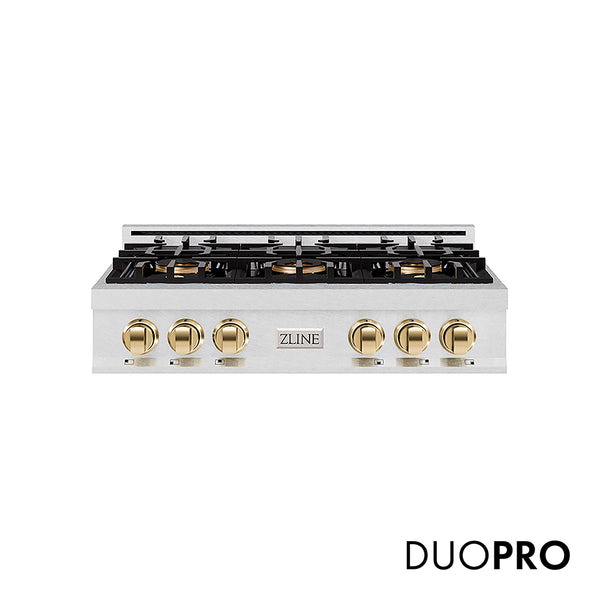 Luxury isn’t meant to be left desired—it’s meant to be attainable. The ZLINE Autograph Edition 36 in. Classic Gas Rangetop with 6 Burner DuoPro™ Cooktop in Satin Stainless Steel and Polished Gold Accents (PCRTSZ-36-G) features a high-powered gas cooktop with 6 hand-crafted Italian dual-ring brass burners and an expansive one-piece porcelain cooktop allowing you to master every meal. With ZLINE DuoPro™, every burner brings the performance you need—wherever you need it.