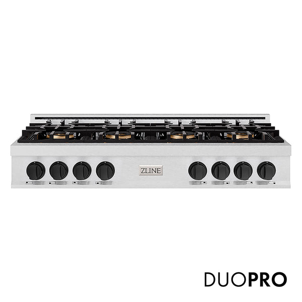 Luxury isn’t meant to be left desired—it’s meant to be attainable. The ZLINE Autograph Edition 48 in. Classic Gas Rangetop with 8 Burner DuoPro™ Cooktop in Satin Stainless Steel and Matte Black Accents (PCRTSZ-48-MB) features a high-powered gas cooktop with 6 hand-crafted Italian dual-ring brass burners and an expansive one-piece porcelain cooktop allowing you to master every meal. With ZLINE DuoPro™, every burner brings the performance you need—wherever you need it.
