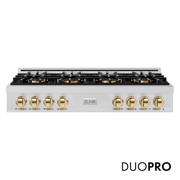 Luxury isn’t meant to be left desired—it’s meant to be attainable. The ZLINE Autograph Edition 48 in. Classic Gas Rangetop with 8 Burner DuoPro™ Cooktop in Stainless Steel and Polished Gold Accents (PCRTZ-48-G) features a high-powered gas cooktop with 6 hand-crafted Italian dual-ring brass burners and an expansive one-piece porcelain cooktop allowing you to master every meal. With ZLINE DuoPro™, every burner brings the performance you need—wherever you need it.