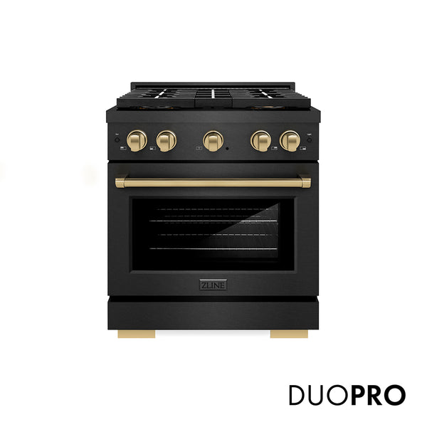 Luxury isn’t meant to be left desired—it’s meant to be attainable. The ZLINE Autograph Edition 30 in. 4.2 cu. ft. Paramount Dual Fuel Range with 4 Burner DuoPro™ Cooktop and Electric Convection Oven in Black Satin Stainless Steel and Champagne Bronze Accents (PSDRBSZ-30-CB) features a high-powered gas cooktop with 4 hand-crafted Italian dual-ring brass burners and a versatile electric convection oven allowing you to master every meal. With ZLINE DuoPro™, every burner brings the performance you need—wherever you need it.