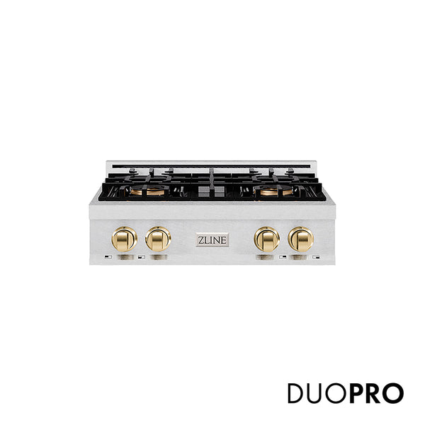 ZLINE Autograph Edition 30 in. Classic Gas Rangetop with 4 Burner DuoPro™ Cooktop in Satin Stainless Steel and Polished Gold Accents (PCRTSZ-30-G)