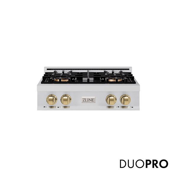 Luxury isn’t meant to be left desired—it’s meant to be attainable. The ZLINE Autograph Edition 30 in. Classic Gas Rangetop with 4 Burner DuoPro™ Cooktop in Stainless Steel and Champagne Bronze Accents (PCRTZ-30-CB) features a high-powered gas cooktop with 4 hand-crafted Italian dual-ring brass burners and an expansive one-piece porcelain cooktop allowing you to master every meal. With ZLINE DuoPro™, every burner brings the performance you need—wherever you need it.