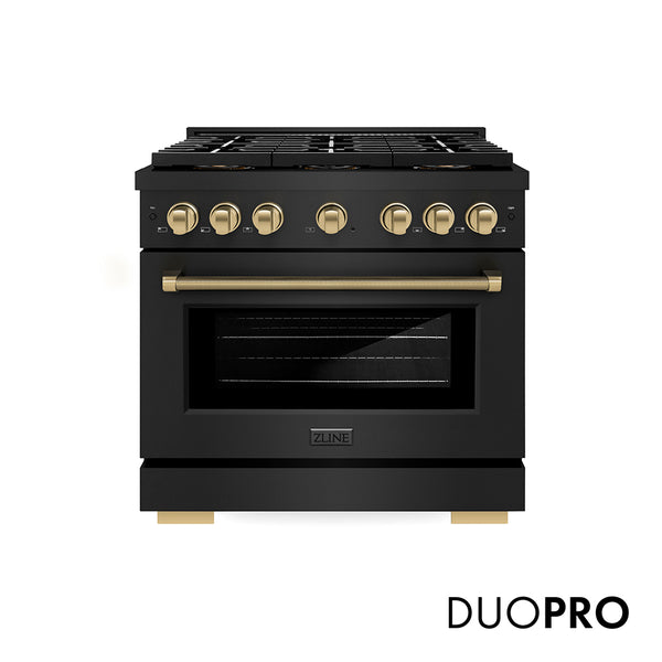Luxury isn’t meant to be left desired—it’s meant to be attainable. The ZLINE Autograph Edition 36 in. 5.2 cu. ft. Paramount Dual Fuel Range with 6 Burner DuoPro™ Cooktop and Electric Convection Oven in Black Stainless Steel with Champagne Bronze Helix Handle and Accents (PSDRBZ-36-KCB) features a high-powered gas cooktop with 6 hand-crafted Italian dual-ring brass burners and a versatile electric convection oven allowing you to master every meal. With ZLINE DuoPro™, every burner brings the performance you need—wherever you need it.